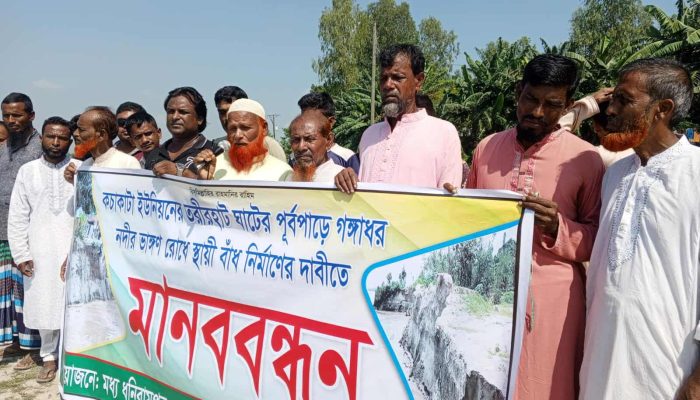 কুড়িগ্রামের কচাকাটায় গঙ্গাধর নদীর ভয়াবহ ভাঙন রোধ ও স্থায়ী বাঁধ নির্মাণের দাবিতে মানববন্ধন অনুষ্ঠিত হয়েছে।
