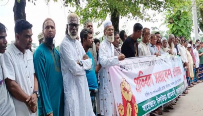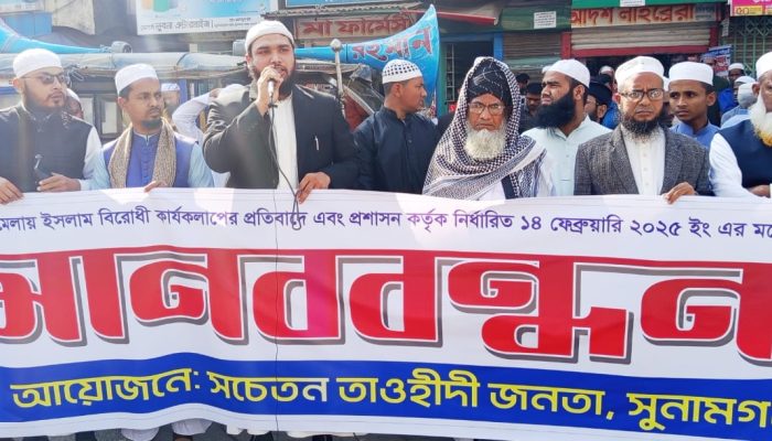 সুনামগঞ্জের বানিজ্য মেলায় ইসলাম বিরোধী কার্যকলাপের প্রতিবাদে তৌহিদী জনতার মানববন্ধন